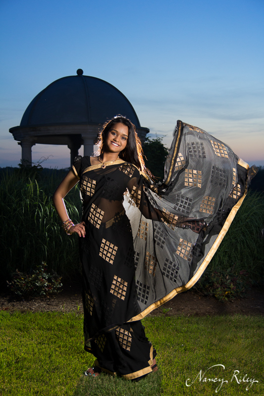 I didn’t realize it was getting so late because we were having so much fun. Luckily, her mom was watching the clock and reminded me it would take Allie some time to change into her sari. It was just past sunset when she was ready. I had loved the black and gold sari when we picked it out at her consultation, but when she was wearing it, it looked even more stunning.